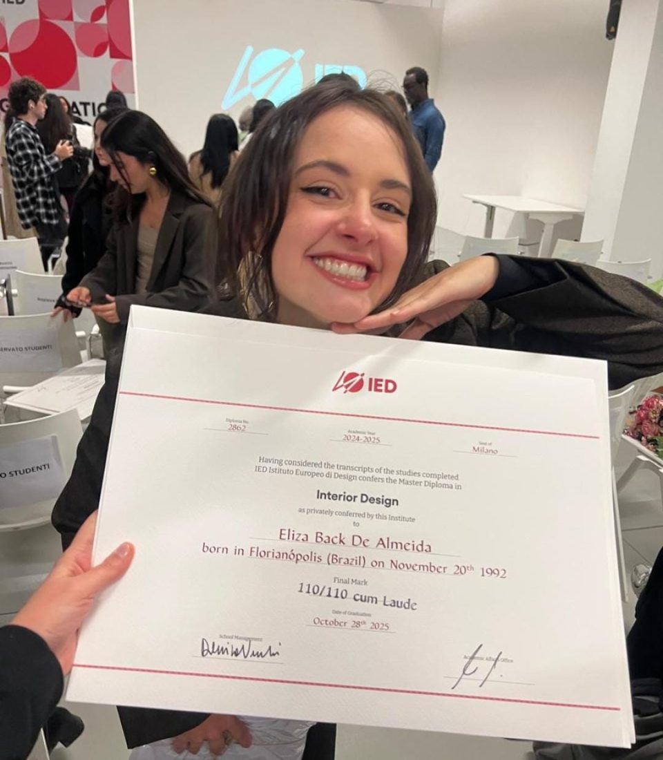 A arquiteta Eliza Back de Almeida, natural de Florianópolis, conquistou nota máxima e recebeu a distinção “Cum Laude” (Com Louvor) na conclusão do Mestrado em Design de Interiores do Istituto Europeo di Design (IED), em Milão — uma das mais renomadas instituições de design do mundo.