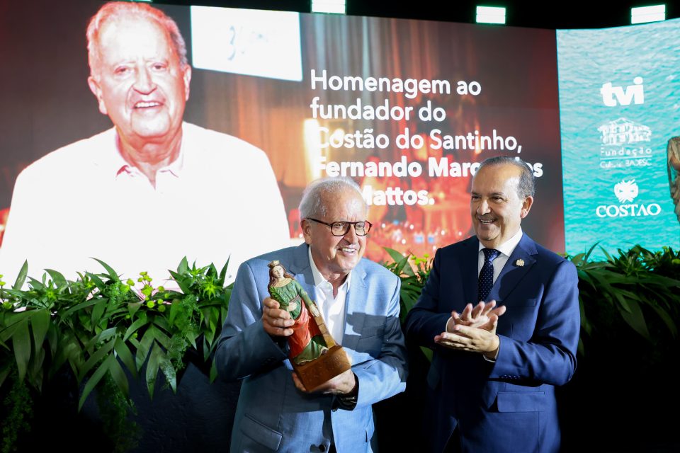 Fundador do Costao do Santinho Resort, empreendimento que se consolidou como um dos principais ícones do turismo nacional, Fernando Marcondes foi homenageado com a entrega de uma imagem de Santa Catarina, símbolo do reconhecimento ao legado de quem ajudou a posicionar o Estado como referência em hospitalidade, sustentabilidade e excelência em serviços. O momento foi marcado por aplausos de pé de todos os presentes. A cerimônia integrou o evento que celebrou a parceria entre o Governo de Santa Catarina, por meio da Secretaria de Estado do Turismo (SETUR) e da Fundação Cultural BADESC, e a emissora portuguesa TVI, responsável pela nova superprodução Terra Forte. Gravada em cenários deslumbrantes de Florianópolis e dos Açores, a novela promete projetar a imagem e as belezas catarinenses para milhões de telespectadores em Portugal e em diversos países, através da TVI e do serviço de streaming Prime Video. |