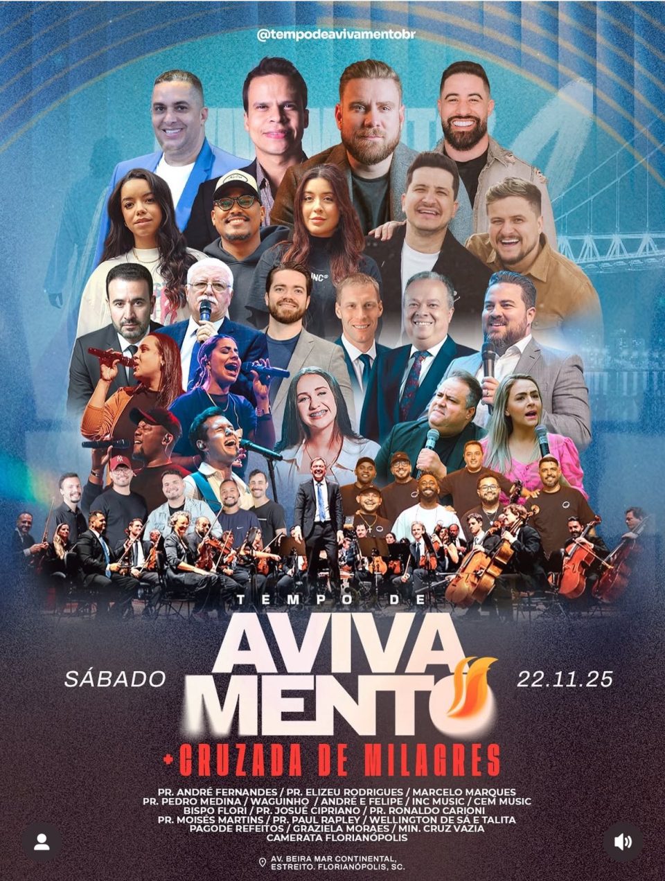 No sábado, 22 de novembro, a Beira-Mar Continental será palco do Tempo de Avivamento, um evento gratuito que reunirá nomes relevantes da música gospel, lideranças espirituais de várias partes do país, apresentação inédita da Camerata Florianópolis e uma grande ação social aberta à população. A partir das 10h, a comunidade terá acesso aos atendimentos sociais; e ao meio-dia iniciam-se as apresentações e atividades no palco que se estendem até às 22h.