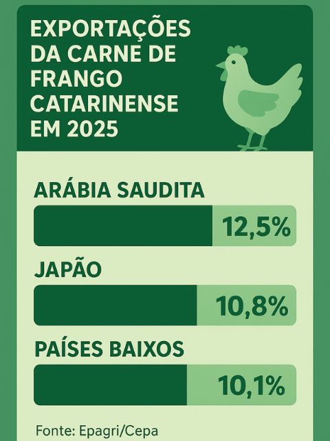 A retirada do embargo chinês sobre as importações brasileiras de aves também deve gerar resultados positivos para o Estado. As vendas para aquele país, que estavam suspensas desde meados de maio, foram novamente autorizadas no dia 7 de novembro. Em 2024, a China foi o quarto principal destino do frango catarinense, respondendo por 9,1% do volume embarcado por Santa Catarina.