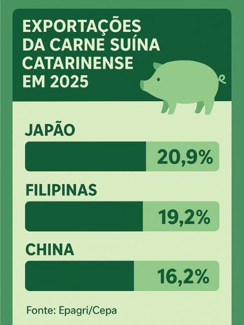 O Japão consolidou-se como o principal destino da carne suína catarinense, respondendo por 20,9% da receita total, seguido por Filipinas (19,2%) e China (16,2%). O destaque vai para o México, que subiu ao quarto lugar no ranking, com crescimento acima de 60% nas vendas para aquele país.