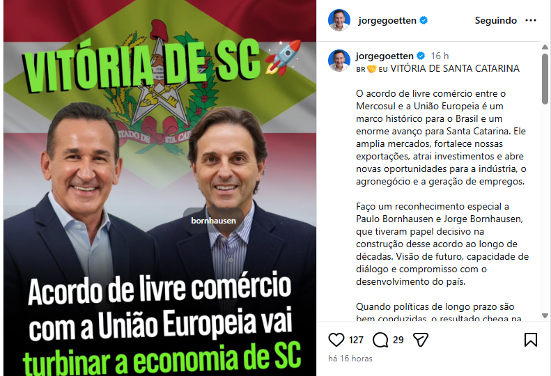 Goetten ressaltou que esse avanço é resultado de um trabalho construído ao longo de décadas e fez questão de parabenizar Paulo Bornhausen e seu pai, Doutor Jorge Bornhausen, pela contribuição decisiva no início e na condução desse processo. Doutor Jorge Bornhausen teve papel relevante na articulação política e institucional que lançou as bases do acordo, enquanto Paulo Bornhausen atuou de forma estratégica na defesa da integração econômica e na aproximação entre o Brasil e a União Europeia.