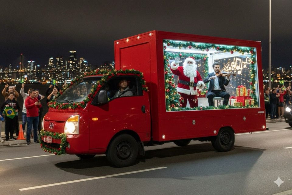 A programação tem três momentos principais. Nos dias 11 e 12/12, um caminhão vitrine percorre a cidade das 17h às 21h, com apresentação ao vivo do violinista Charles Espíndola, que interpreta clássicos e trilhas natalinas no violino, levando a música às ruas em formato de palco itinerante. No dia 13/12, o caminhão também circula das 18h às 19h, faz parada na praça do Kobrasol e permanece até as 21h. Neste dia o caminhão vai integrar o evento final, que acontece das 18h às 21h, na Praça Eugênio Raulino Koerich (próximo ao Melão), onde o público vê apresentações artísticas e a chegada do Papai Noel.