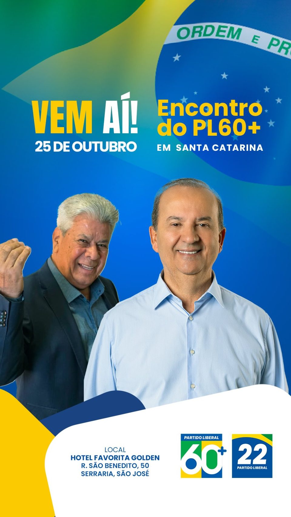 O Lançamento do PL 60+ Santa Catarina vem aí! No dia 25 de outubro, às 15h22, teremos um grande encontro com muita experiência e participação política dos nossos 60+.