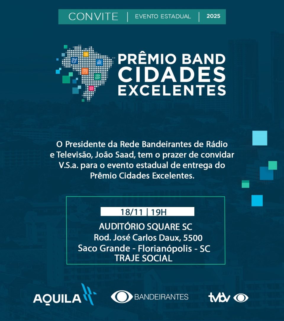 “É com imensa satisfação que nós, da TV Barriga Verde, afiliada da Rede Bandeirantes em Santa Catarina, convidamos Vossa Senhoria para prestigiar a cerimônia de premiação do “Prêmio Band Cidades Excelentes 2025” – Etapa Estadual.