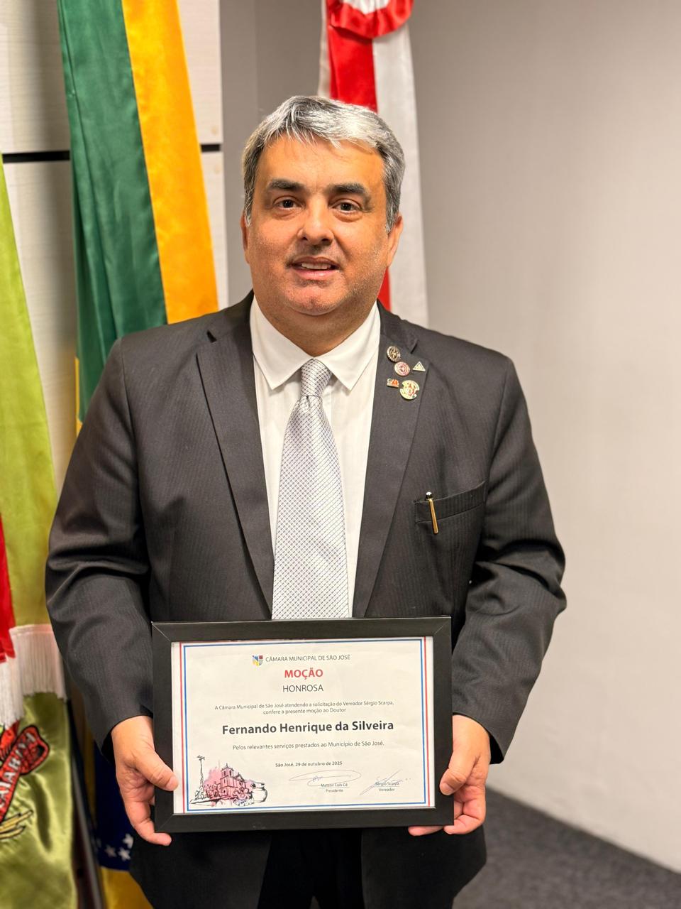 Fernando Henrique da Silveira, servidor público estadual há mais de 30 anos e advogado há mais de 17 anos, foi homenageado pela Câmara de Vereadores de São José, com a Moção nº 0103/2025 – Moção de Aplausos e Reconhecimento. A proposição, aprovada em plenário, é de autoria do vereador Sérgio Vanderlei Scarpa, que destacou a relevância da trajetória de Silveira e os serviços prestados à comunidade josefense.